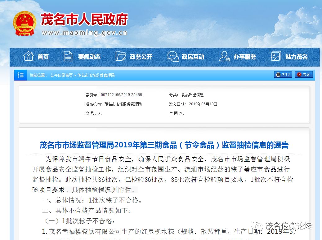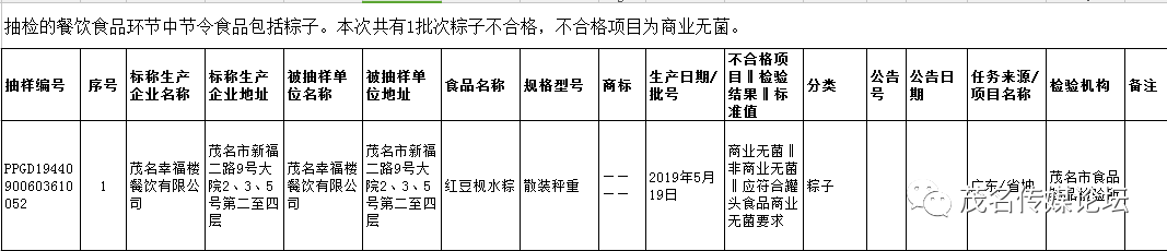 1.茂名幸福楼餐饮有限公司生产的红豆枧水粽(规格:散装秤重,生产日期:2019年5月19日)检出微生物超标,不符合标准规定。检验机构为茂名市食品药品检验所。