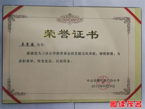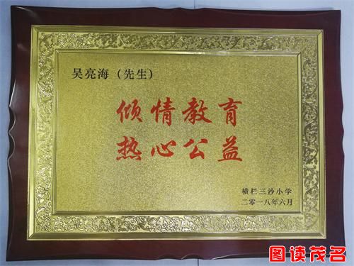 据了解,吴亮海这一善举已经坚持了三年,自2016年到中山市横栏镇斥资6千多万元建设商业大厦开始,吴亮海便与三沙小学结缘,并为当地的教育事业贡献爱心与力量。被三沙小学授予“倾情教育 热心公益”牌匾,以及荣誉证书。