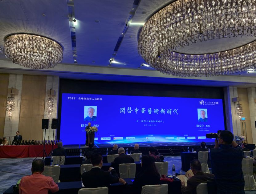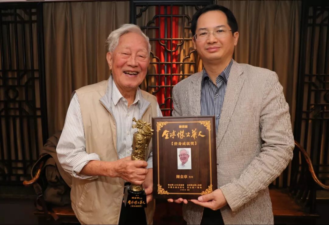 2019全球杰出华人高峰会秘书长黄正浩(右)为陈金章颁奖并合影留念