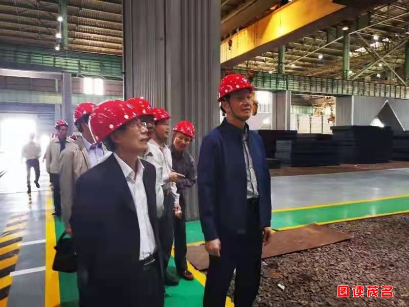 茂名市老促会会长罗明(右一)在湛江市老促会会长麦马佑(左一)陪同参观东海岛宝武集团湛江钢铁有限公司炼、扎钢厂生产车间