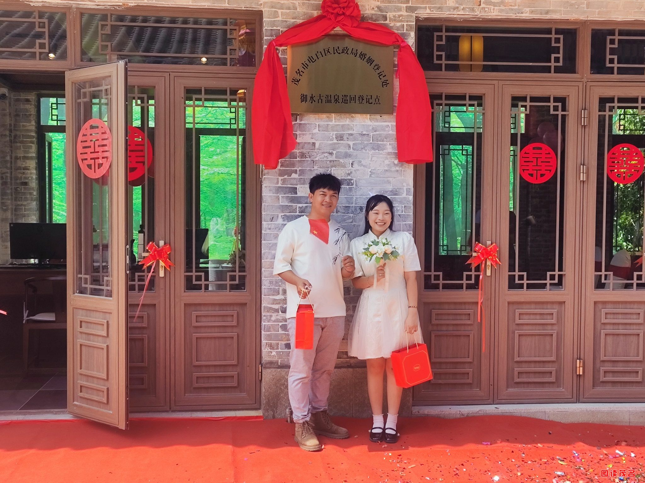 随着茂名市、电白区有关领导与御水古温泉负责人一同走到揭牌台前共同拉下红绸,“茂名市电白区民政局婚姻登记处御水古温泉巡回登记点”牌匾正式亮相,这也标志着这处融合民政服务与文旅特色的登记点就此正式启用。