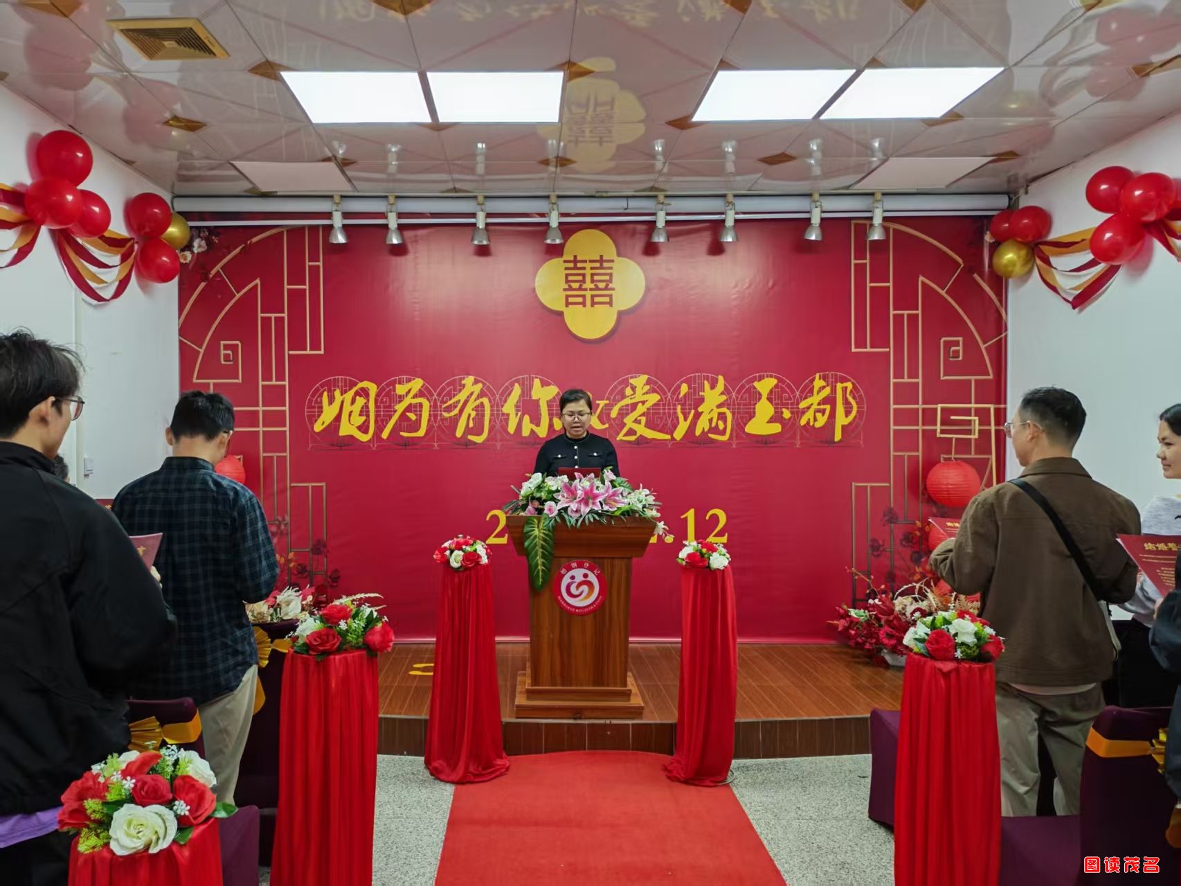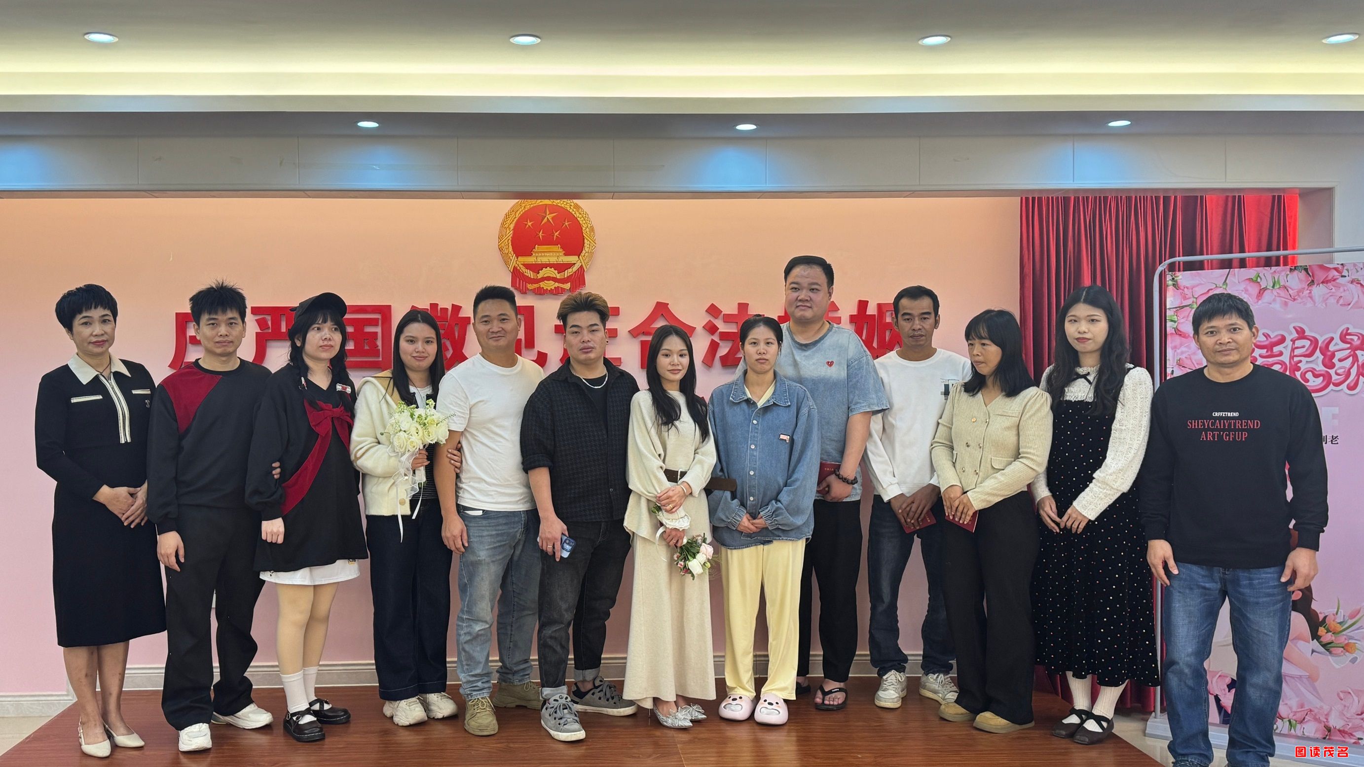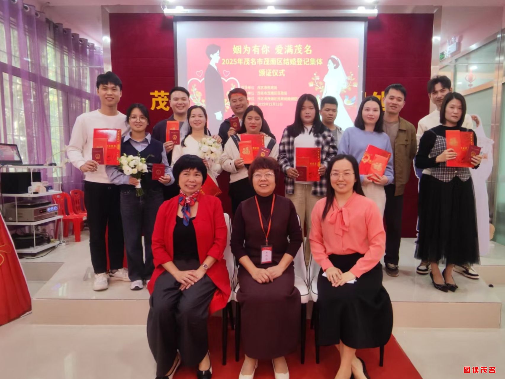 当天上午,茂南区民政局婚姻登记处二楼室内颁证厅内,“姻为有你,爱满茂名”结婚登记集体颁证仪式热闹开启。