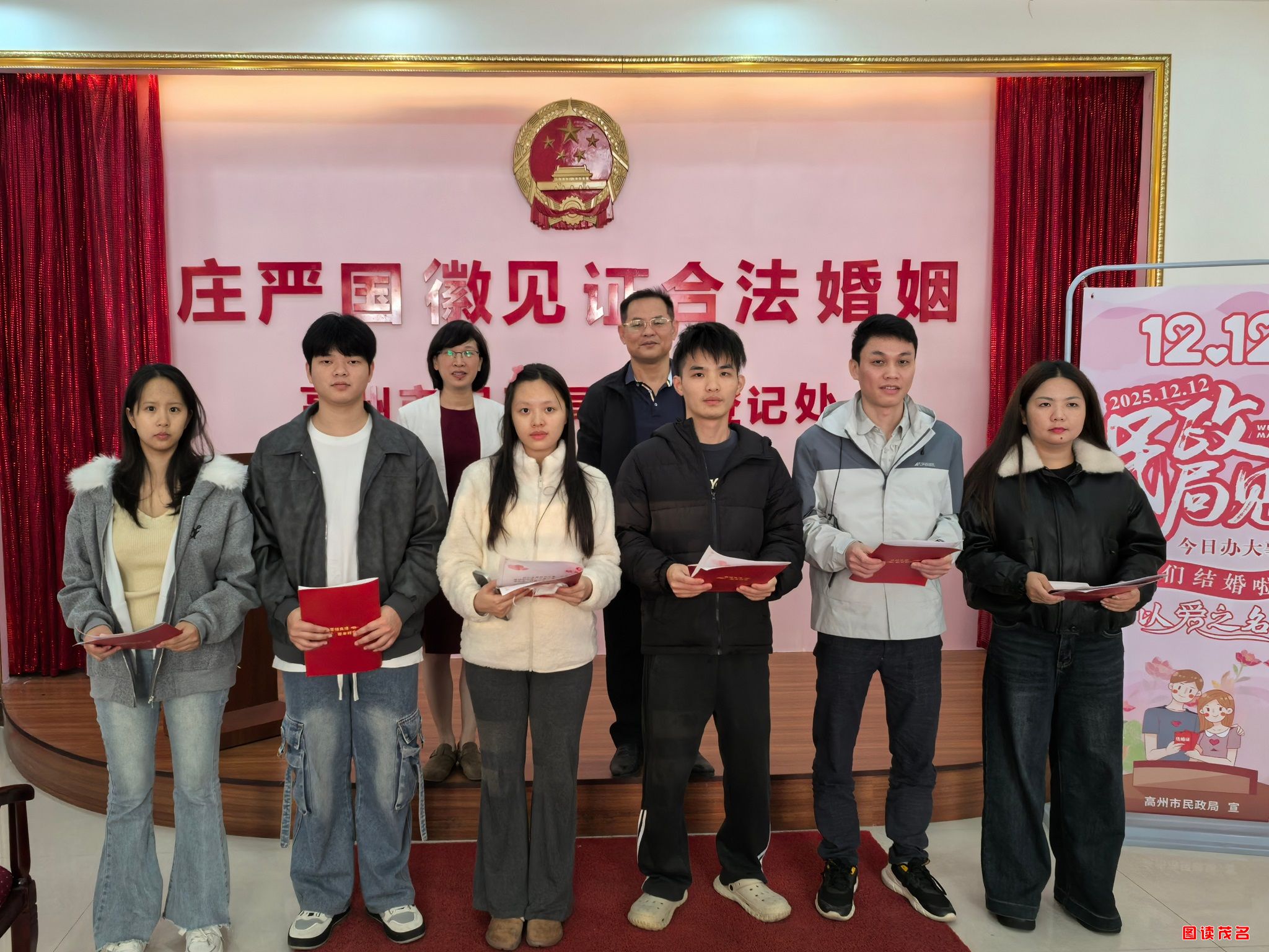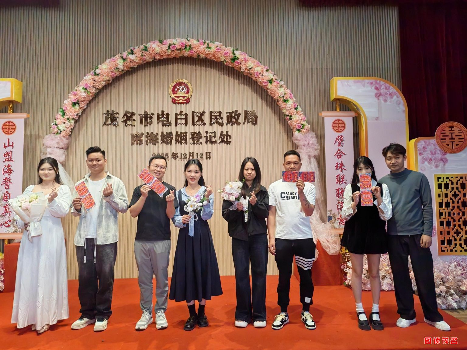 图读茂名网讯 12月12日,茂名全城掀起结婚登记热潮。茂名各地民政部门提前谋划、精准施策,积极打造沉浸式特色颁证活动,助力新人筑牢婚姻基石。当天,结婚登记办理量占婚姻登记总业务量的62.5%,比去年双十二增长20.5%。