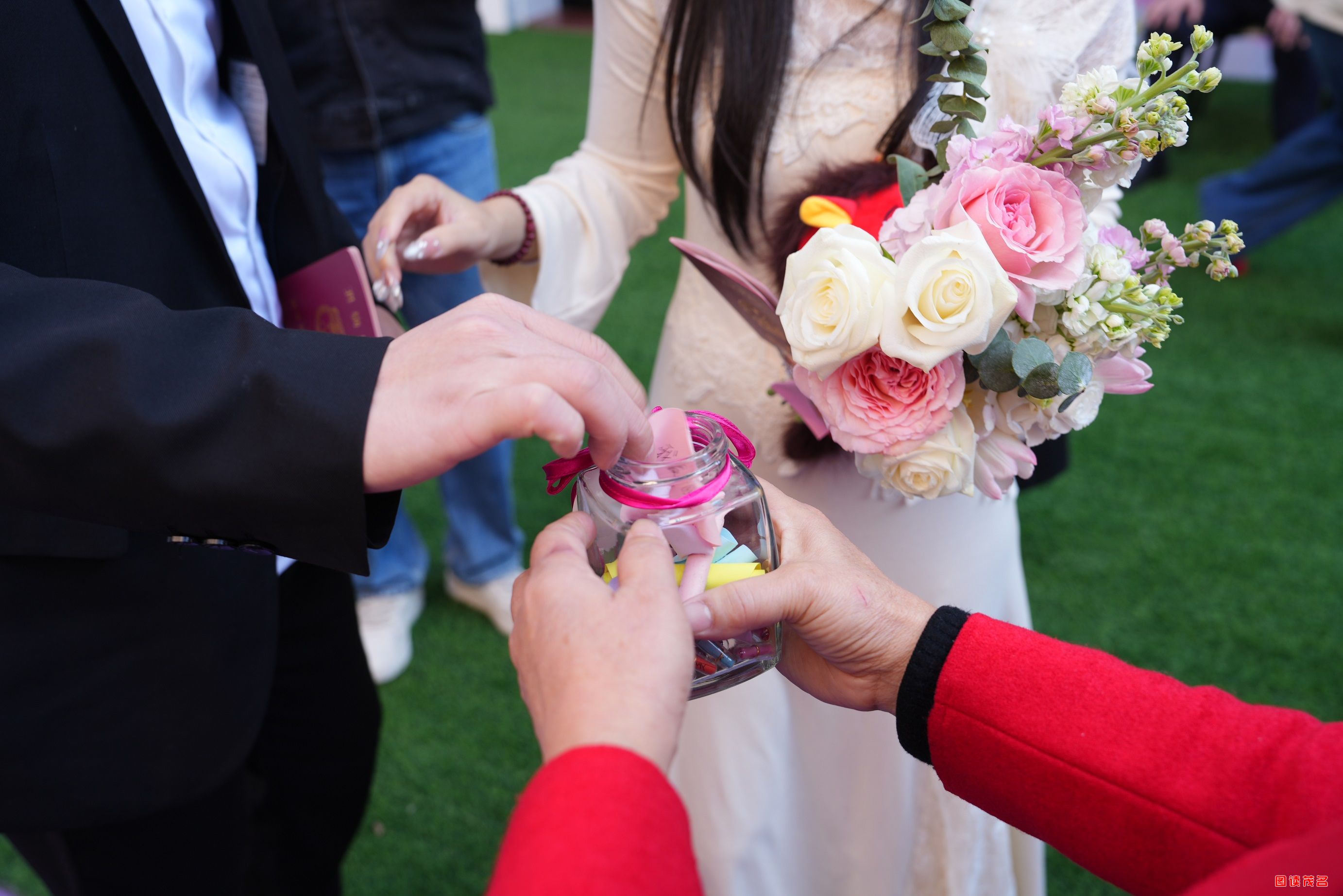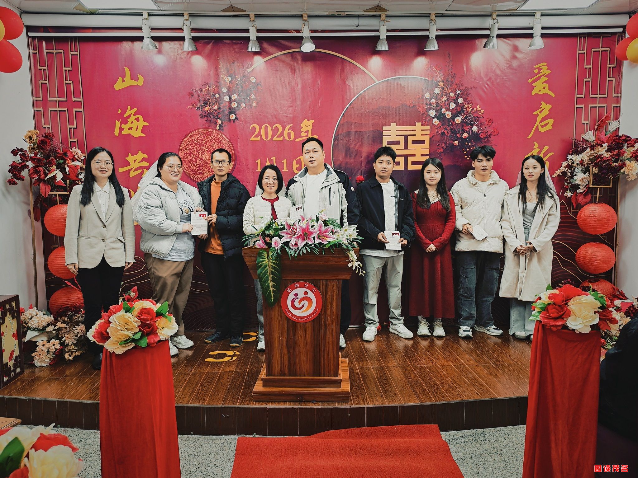 “马韵传情 婚俗启新”集体颁证仪式上,10对新人携亲友欣然赴约。现场“马上有爱”主题布置雅致精巧,马年吉祥物憨态可掬,喜庆氛围扑面而来。新人手捧誓词庄严宣誓,紧握结婚证的双手坚定有力,眼中满是对婚姻的珍视与对未来的期许。马年知识问答、爱情寄语书写、幸运抽奖等互动环节精彩纷呈,兼顾仪式感与趣味性,在欢声笑语中引导新人树立健康文明的婚恋观,定格下新年伊始最动人的幸福瞬间。