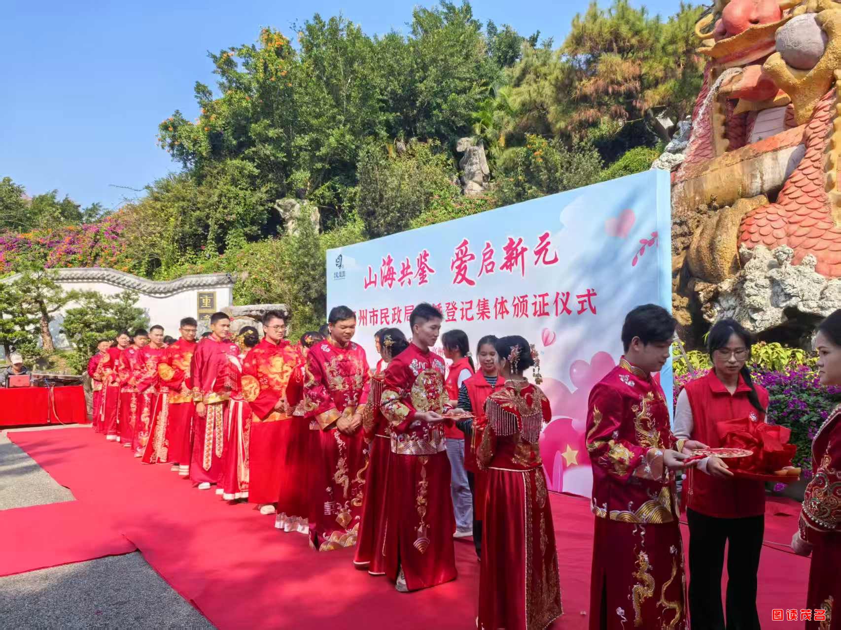 现场布置雅致有序,“彩云献瑞”奇石打卡点、追凤廊、鸳鸯湖、盘龙广场与亭台楼阁、国学长廊交相辉映。高州市民政局组织工作人员与志愿者全程服务,从登记化妆到现场引导、流程保障,环节细致入微,让新人感受婚姻的尊崇温暖,也让游客共享甜蜜喜悦,暖意漫染全场。