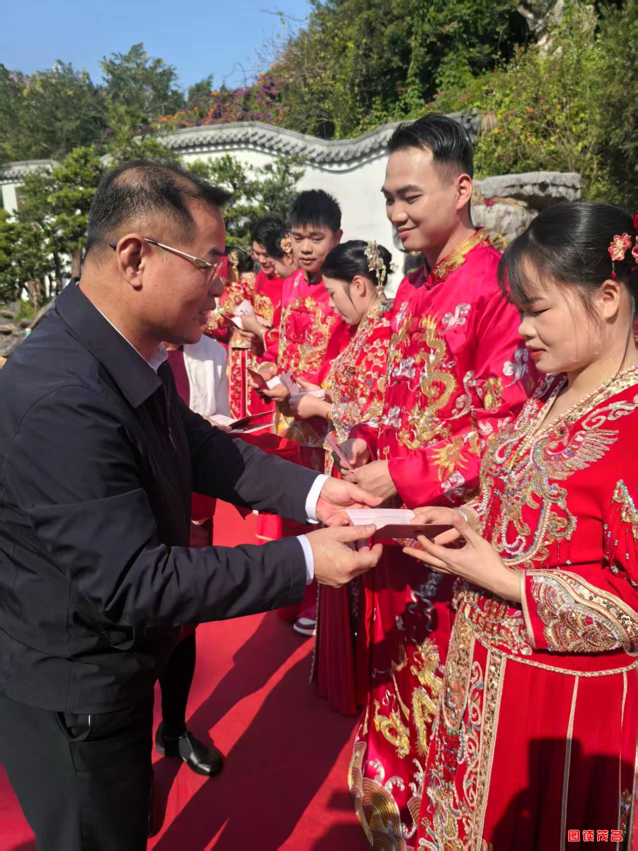 晨光映园,仪式启幕。清晨7时至8时30分,新人在市婚姻登记处办结登记、整理仪容;8时30分后,在工作人员引导下前往凤凰园彩排;9时许,高州市民政局党组书记、局长吕彪、副局长张燕为新人颁发结婚证并送上美好祝福,现场暖意绵长。